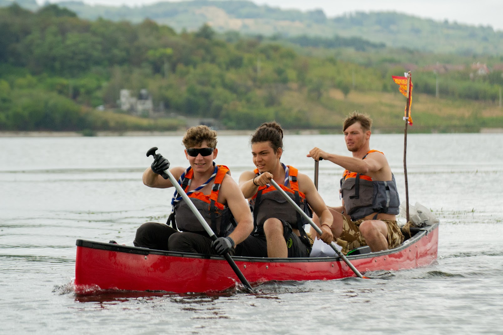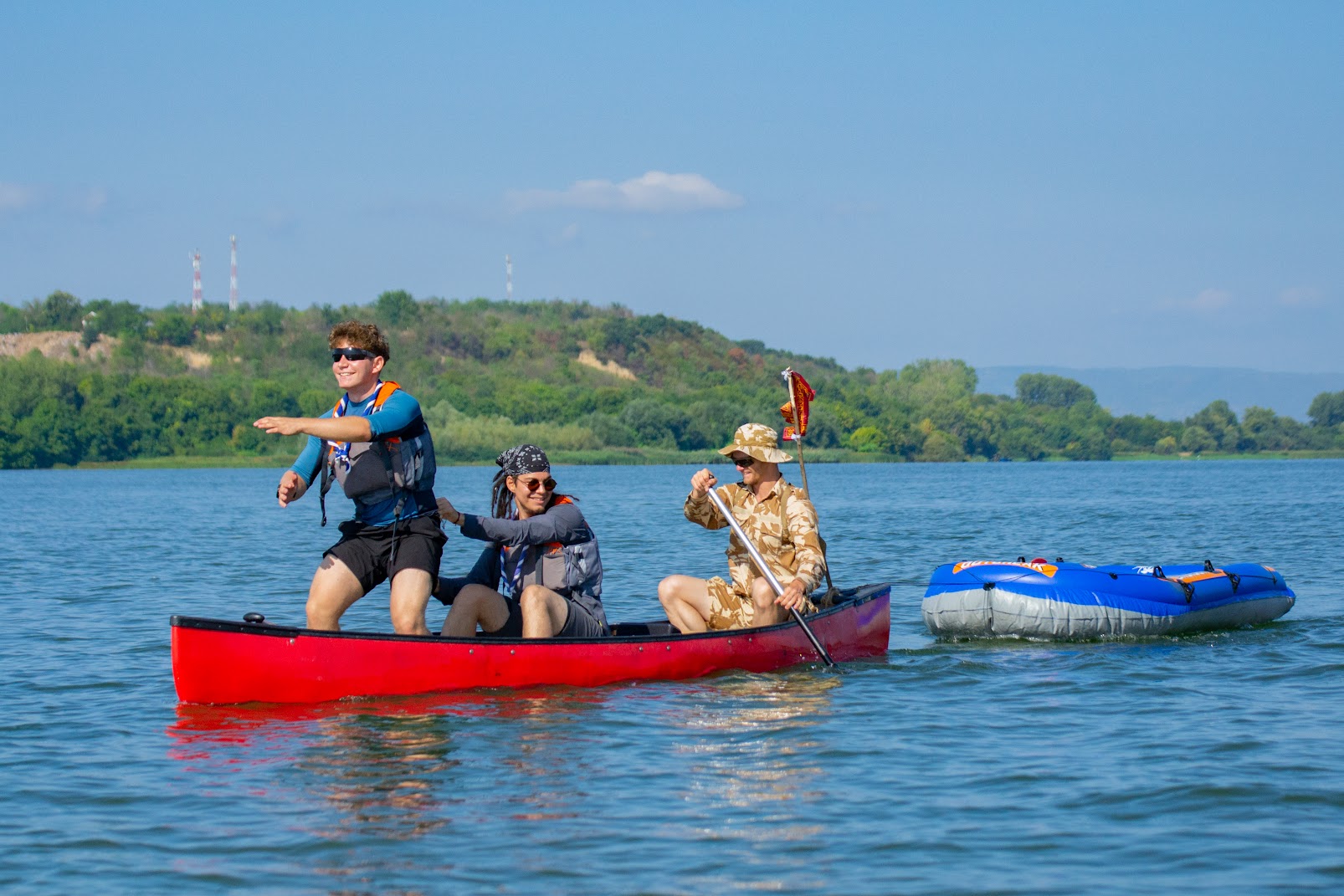 Prima zi a fost cea mai grea. Soare puternic, oboseală și, pe lângă toate, o barcă gonflabilă legată de noi, în care aveam tot felul de lucruri pentru confort. Am aflat pe pielea noastră că o barcă gonflabilă, chiar dacă e plină cu aer, oferă o rezistență incredibilă la înaintare, mai ales cu vânt frontal. Ne mișcam groaznic de încet, iar noi dădeam vina pe faptul că nu aveam tehnică. Ideea de a câștiga concursul deja devenise science-fiction… Pe lângă toate cele de mai sus, am avut și un soare infernal, care și-a lăsat clar amprenta pe toți… mai ales pe cei cu ochelari. 😀